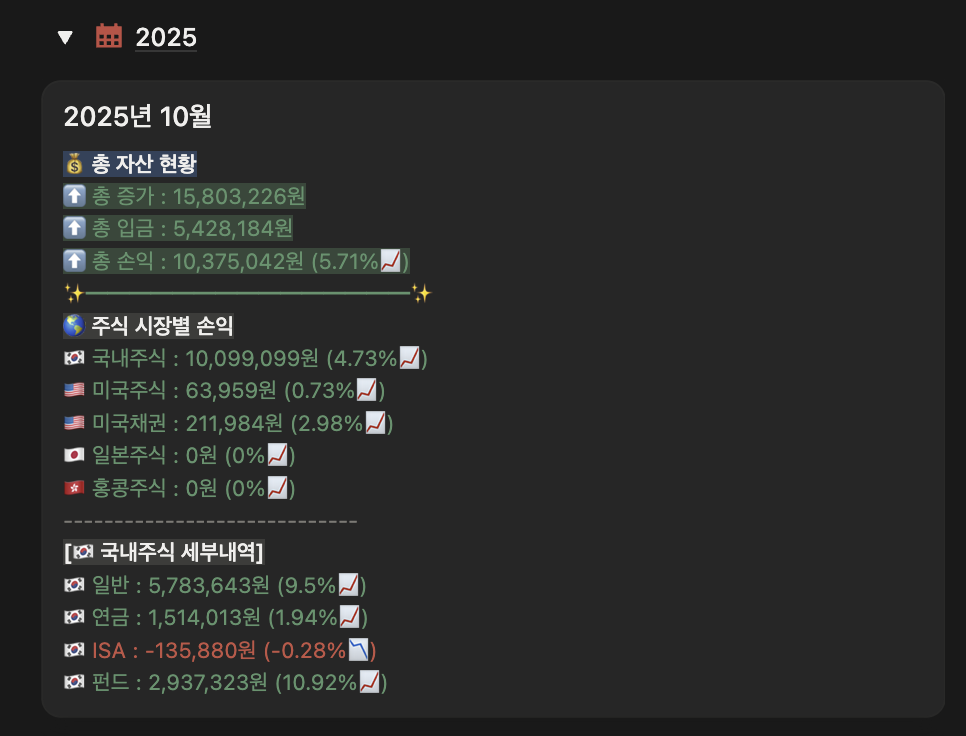 10월은 다행히 수익률이 다시 개선됐다. 국내 주식 영향이 컸다. 하이브가 많이 올랐고, 코스피를 추종하는 펀드&절세 계좌 덕분에 많이 올랐다. ISA는 개별 종목을 사놓은 게 있는데 그 종목의 수익률이 좋지 않아서 유일하게 마이너스.