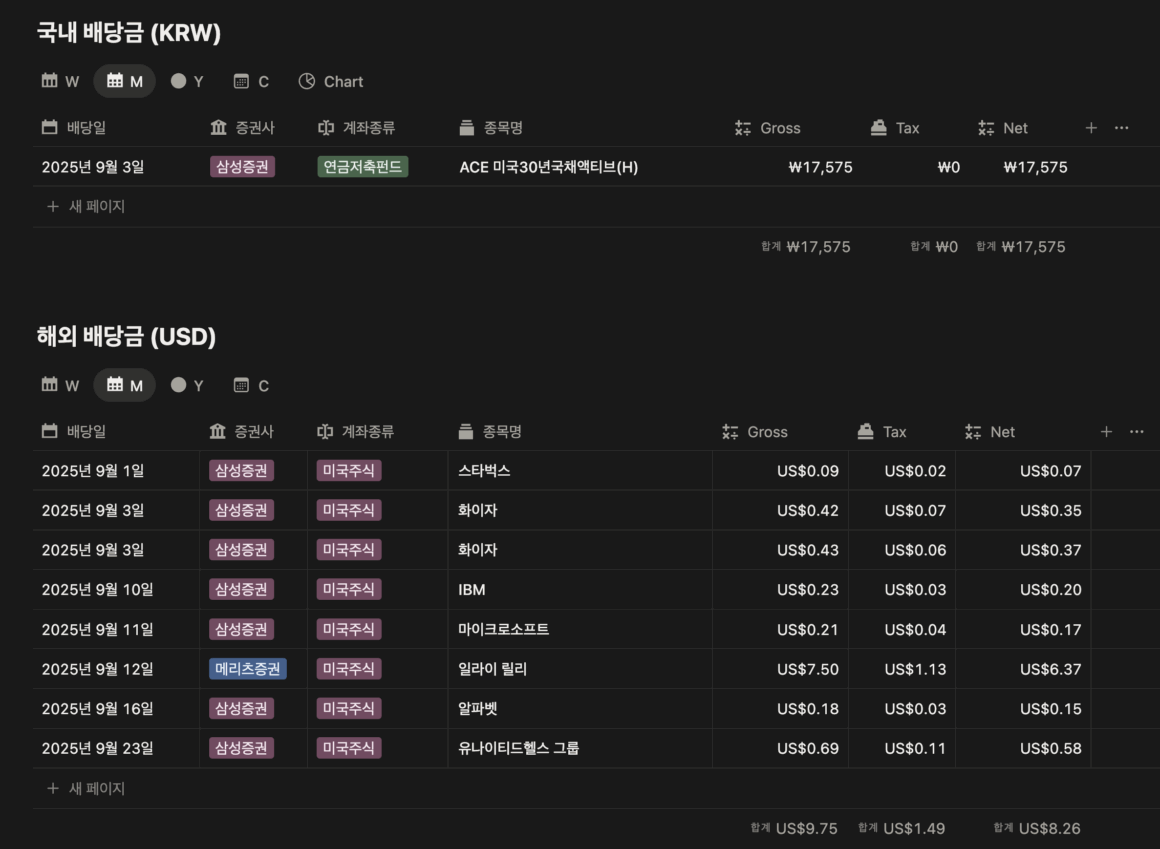한국, 미국 배당주들을 모두 정리해서 이제 배당 나올 구석이 없지만 그럼에도 미 장기채, 소수점에서 소소하게 배당이 나온다. 국내에서는 월배당으로 고정 1.8만 정도 나오고, 달러도 야금야금 모아보니 10달러 정도 모이니 쏠쏠함. 올해 미국 주식을 처분하느라 양도소득세가 조금 많이 나올 것 같은데 커버드콜로 양도소득세를 좀 줄여야겠다. 얼마나 줄일 수 있을지는 모르겠지만.