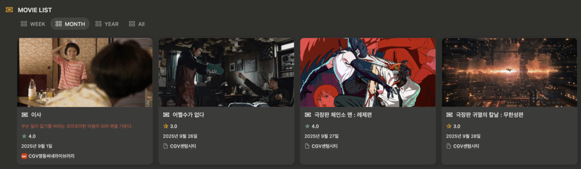 9월에는 영화를 총 4편 관람했다. 명동에서 1편. 부산 센텀시티에서 3편. 가장 기대하지 않았던 체인소 맨이 제일 재밌었다. 4DX로 보면 재밌겠다 싶었는데 N차 관람하고 싶어도 좀처럼 자리가 나지 않는다. 요즘 극장에 일본 고전 작품들이 많이 재개봉해서 틈틈이 보러 가고 싶은데, 예전처럼 극장에 가고픈 마음이 많이 사라짐. 전에는 시간을 만들어서라도 갔는데 이제는 시간이 맞지 않으면 안 가는 중. 제일 기대했던 영화 어쩔수가 없다는 내 스타일이 아니었음. 박찬욱 감독 작품은 대개 마니아틱하긴 해도 내가 그 마니아 바운더리에 속하긴 했는데 이번엔 아쉬웠다.