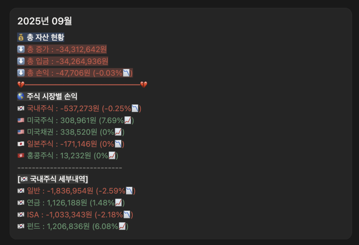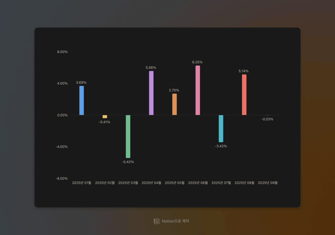 올해는 관세 이슈가 있던 3월과 하이브가 폭락했던 7월에 좀 빠졌고, 그 외에는 수익률이 나쁘지 않다. 얼른 집을 매수하고 주식 시장으로 제대로 다시 돌아와야겠다.